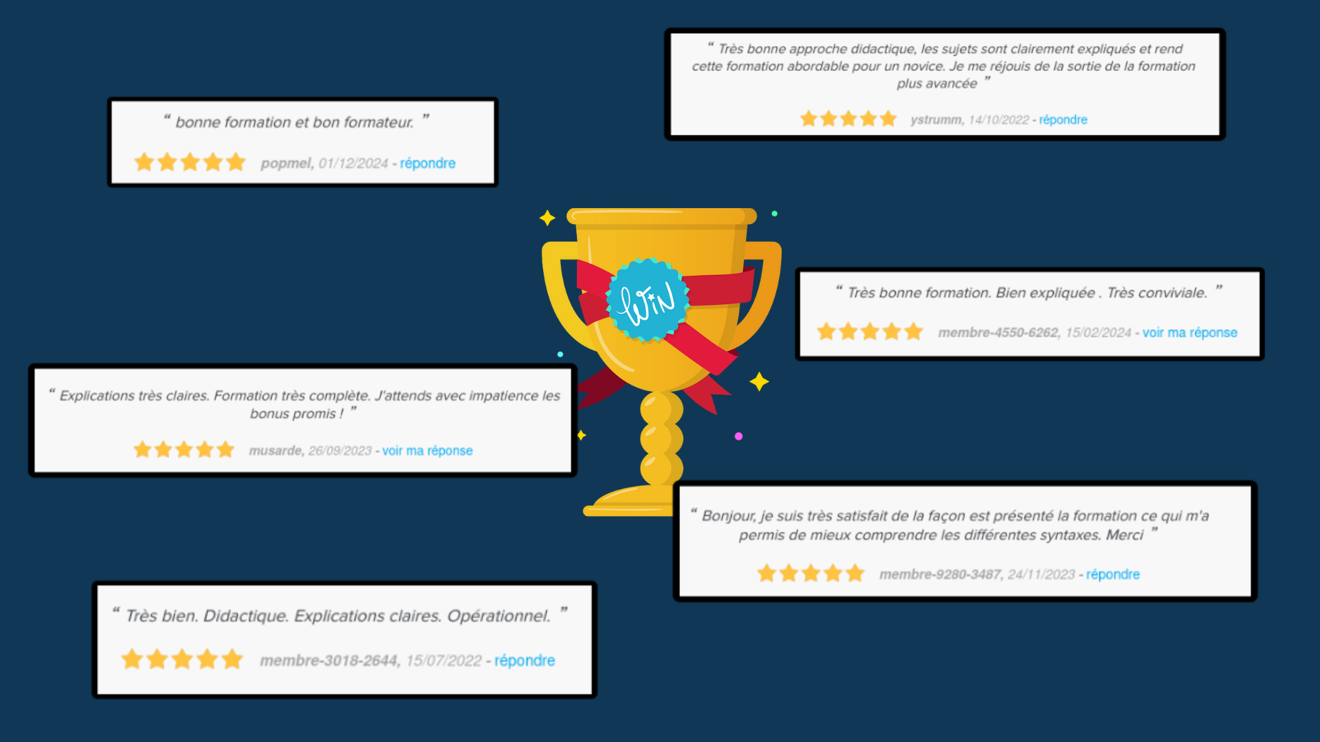 Quelques commentaires des apprenants ayant suivi mes formations en ligne sur le site Tuto.com